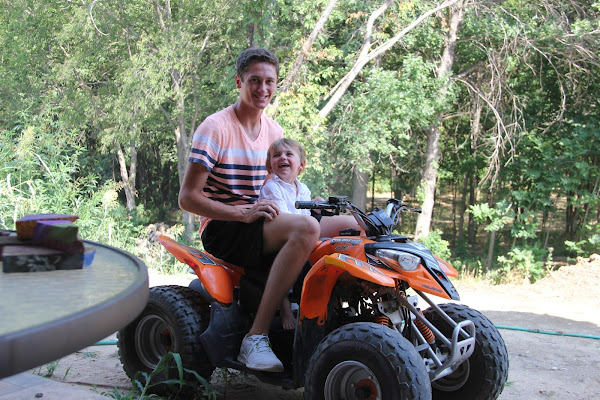 eden and ava adore their older girl cousins, addie and bailey. i would often find them up in their room doing hair or hanging out or huddled under a blanket watching a movie. they were hooked to their hips for a week and a half. jack is and was all about his cousin zach. jack would beg him to play video games with him and sweet zach always would. jonah on the other hand, was obsessed with nobody, his obsession was with something, "the ride", aka the quad. that boy could think about nothing else. he was your best friend as long as you were giving him a ride.